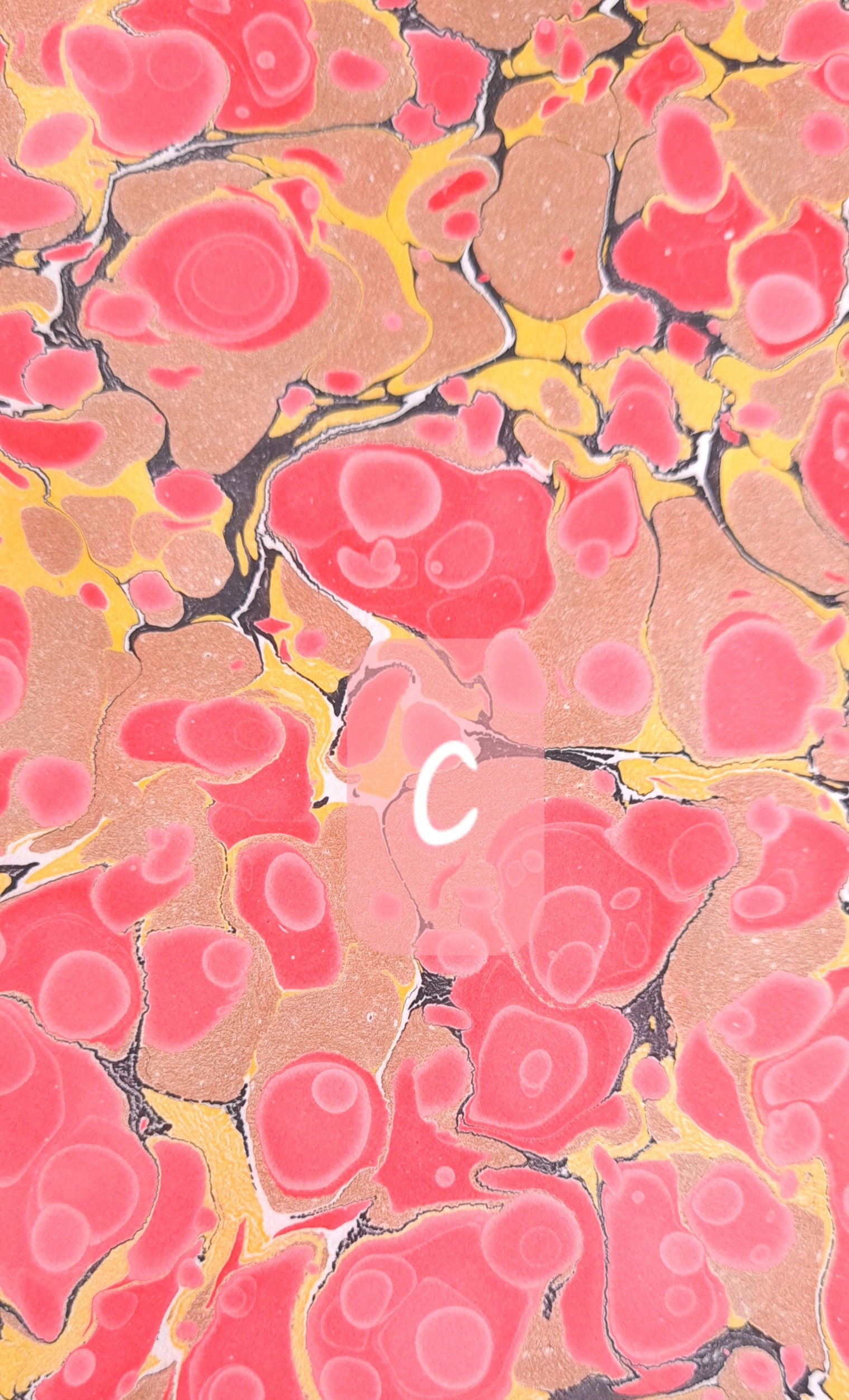 Cool red on earth colour. Made with watercolour based marbling paint on soft white, acid free 120 gsm paper. It is in size 49 x 34 cm.